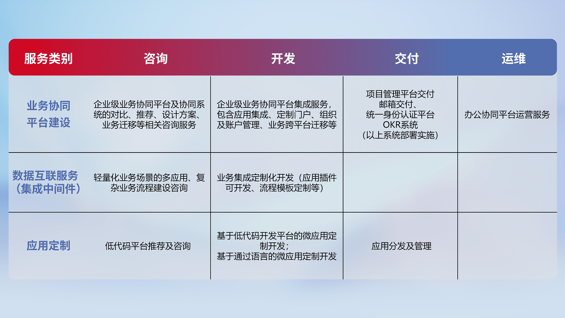 针对钉钉、、、企微、、、IDaas等平台级产品提供产品的规划、、方案、、、、交付、、、定制化开发等服务,,实现如统一协同办公、、、智能客户服务、、混合会议管理、、智能数据查询、、等业务场景,,实现数字化转型。。。。
